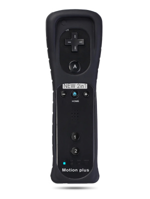 Silikoonümbrisega musta värvi MotionPlus Wiimote pult Nintendo Wii konsoolile.