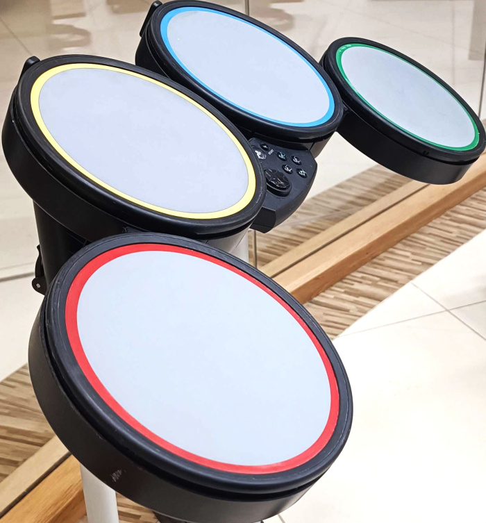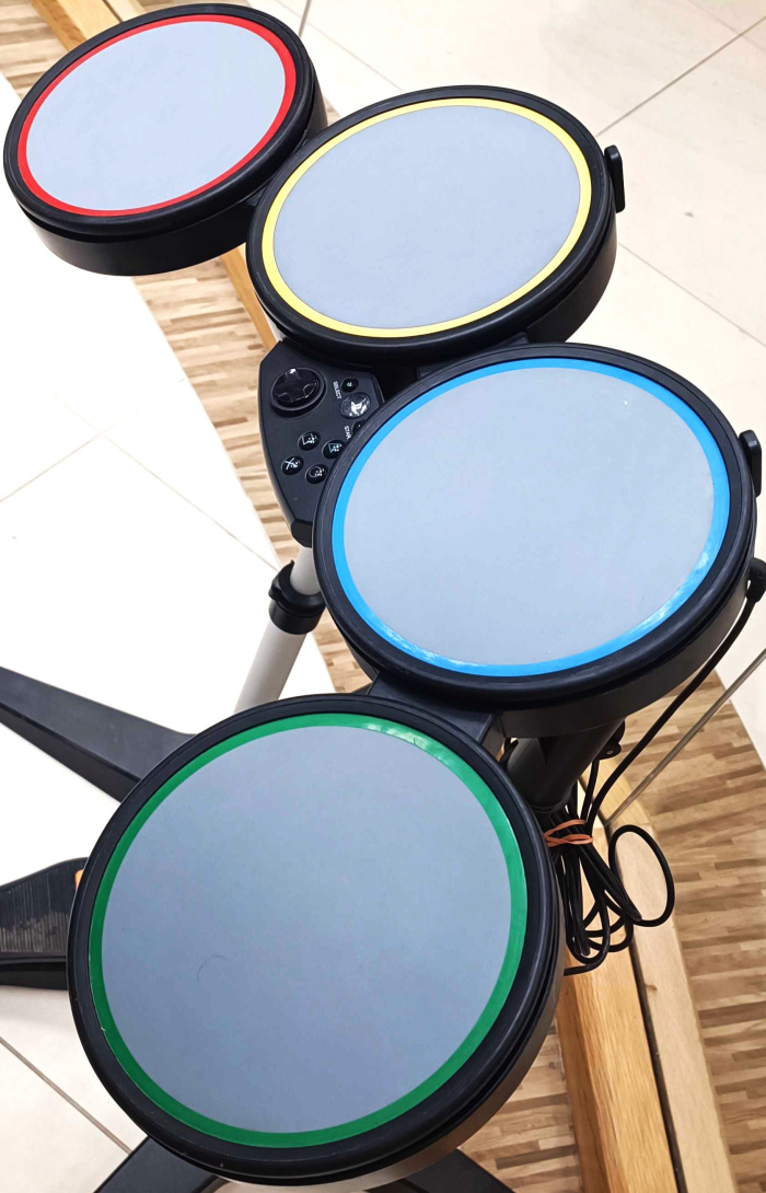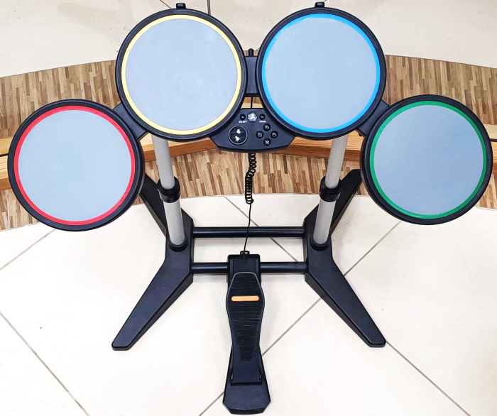 Komplektis on juhtmega Rock Band trummid ja pedaal. Trummipulki komplektis ei ole